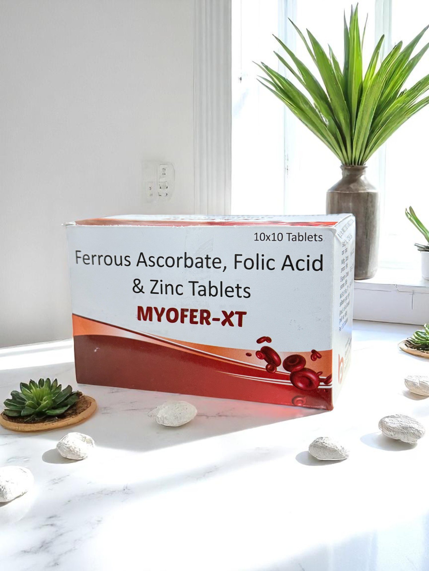 Myofer XT is a nutritional supplement specially formulated to combat iron deficiency anemia and improve overall nutritional health. It combines Ferrous Ascorbate, Folic Acid, and Zinc, making it highly effective for patients suffering from low iron levels, especially pregnant/lactating women and individuals with dietary deficiencies.